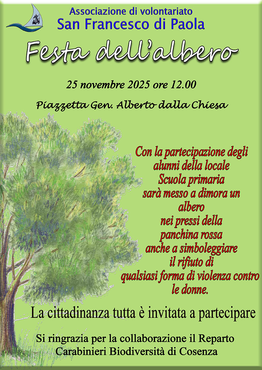Martedì 25 novembre, alle ore 12, l’associazione San Francesco di Paola metterà a dimora un salice piangente nel comune di Bonifati, a Cittadella del Capo. L’albero sarà piantumato in prossimità della scuola primaria e la cerimonia vedrà la partecipazione degli alunni dell’istituto.