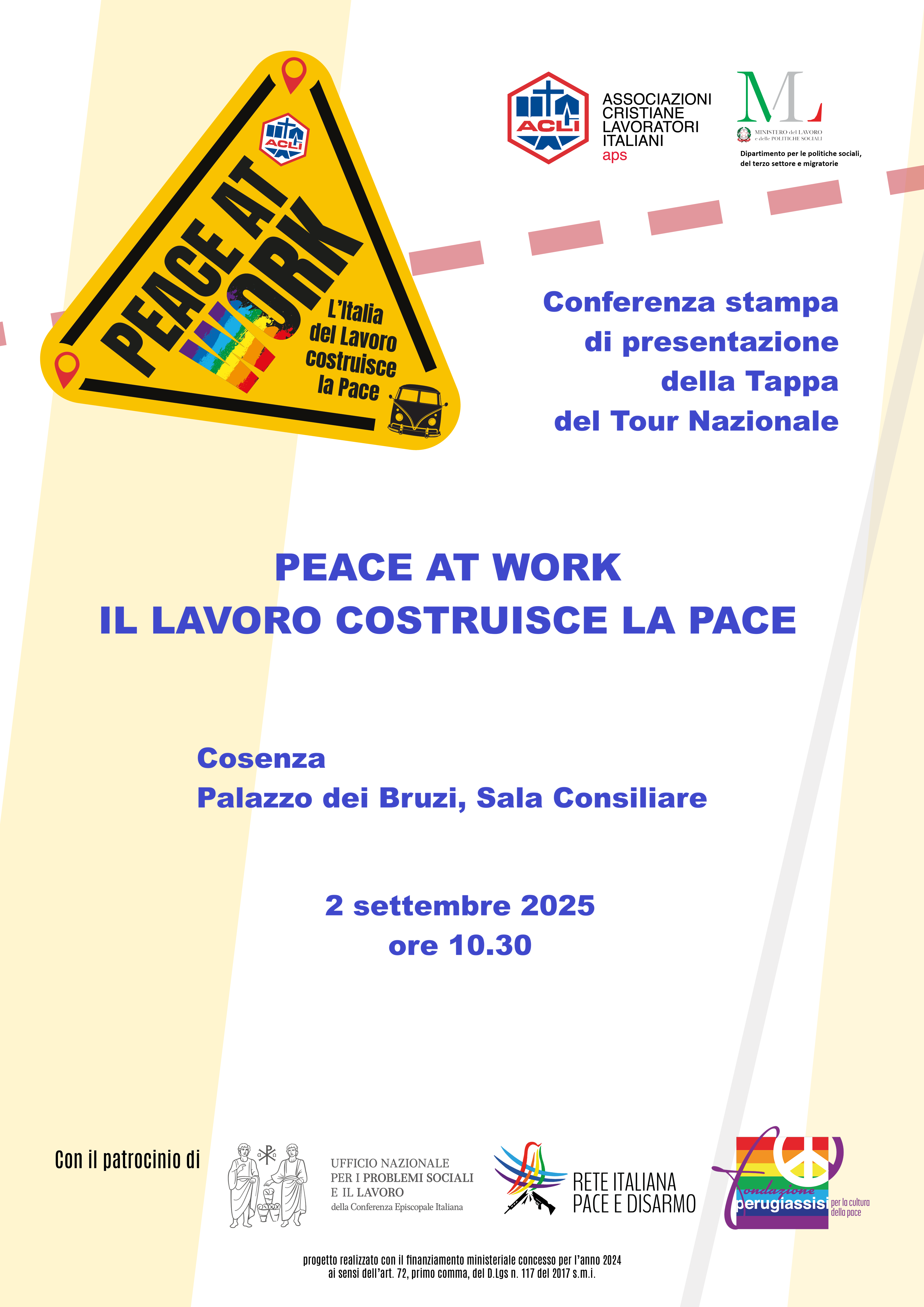 Le ACLI di Cosenza, il prossimo 9 settembre, ospiteranno una tappa della Carovana della Pace “Peace at Work – l’Italia del lavoro costruisce la pace”. La Carovana visiterà nella provincia di Cosenza la Cooperativa Progetto Germano di Scalea, la Sartoria Sociale “Mettiamoci un Punto” di Santa Domenica Talao e la casa Famiglia “Il Belvedere” di Belvedere Marittimo. Il 2 settembre, alle 10.30, si terrà nella sala consiliare di Palazzo dei Bruzi, a Cosenza, la conferenza stampa di presentazione dell’iniziativa.