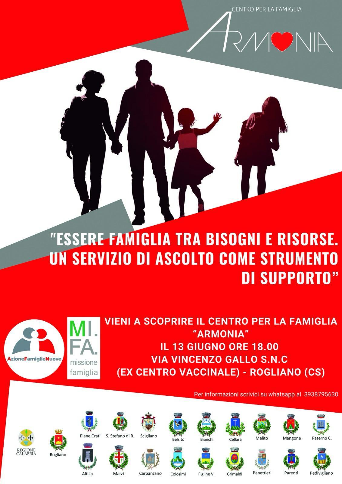 Dal 13 giugno sarà attivo, presso l’ex polo vaccinale di via Vincenzo Gallo, a Rogliano, il centro per la famiglia “Armonia”, uno spazio a supporto della genitorialità (biologica, adottiva affidataria), e di tutti coloro che necessitano di accoglienza ed ascolto.