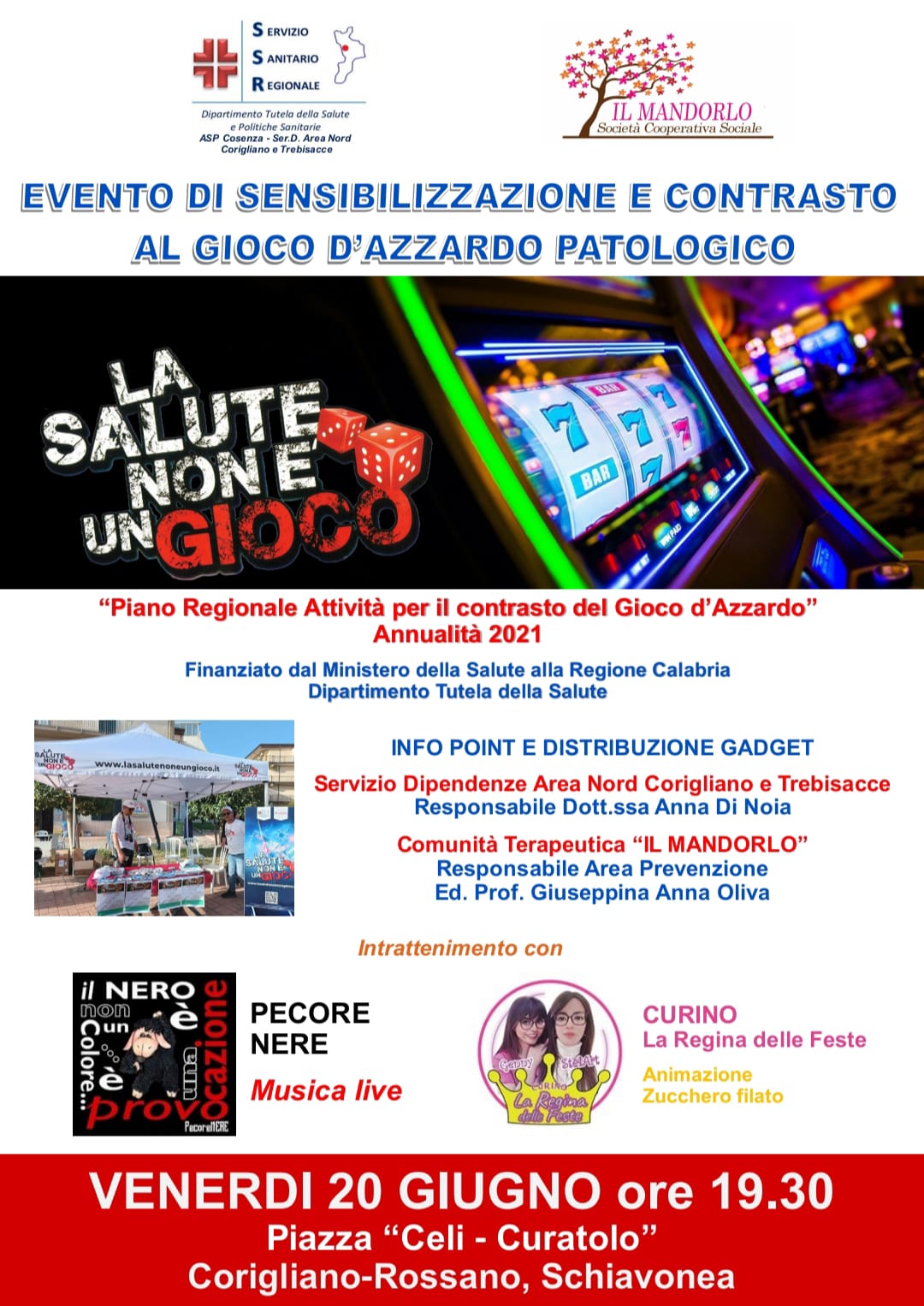 Venerdì 20 giugno, alle ore 19.30, in piazza “Celi – Curatolo” a Schiavonea di Corigliano, nel comune di Corigliano Rossano, la cooperativa sociale Il Mandorlo ha organizzato un evento di sensibilizzazione e contrasto al gioco d’azzardo patologico. Nell’occasione sarà allestito un info point e saranno distribuiti gadget.