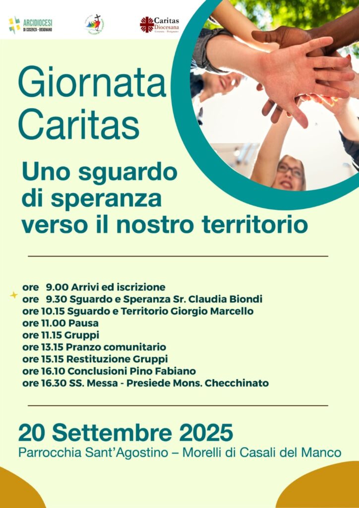 Uno sguardo di speranza verso il nostro territorio. Si chiama così la Giornata della Caritas di Cosenza – Bisignano organizzata per sabato 20 settembre, dalle ore 9 fino al pomeriggio, nella Parrocchia Sant’Agostino di Morelli, a Casali del Manco. Ci saranno interventi di suor Claudia Biondi, di Giorgio Marcello e del direttore Pino Fabiano. La giornata si concluderà con la Santa Messa presieduta dall’Arcivescovo di Cosenza – Bisignano, Giovanni Checchinato.