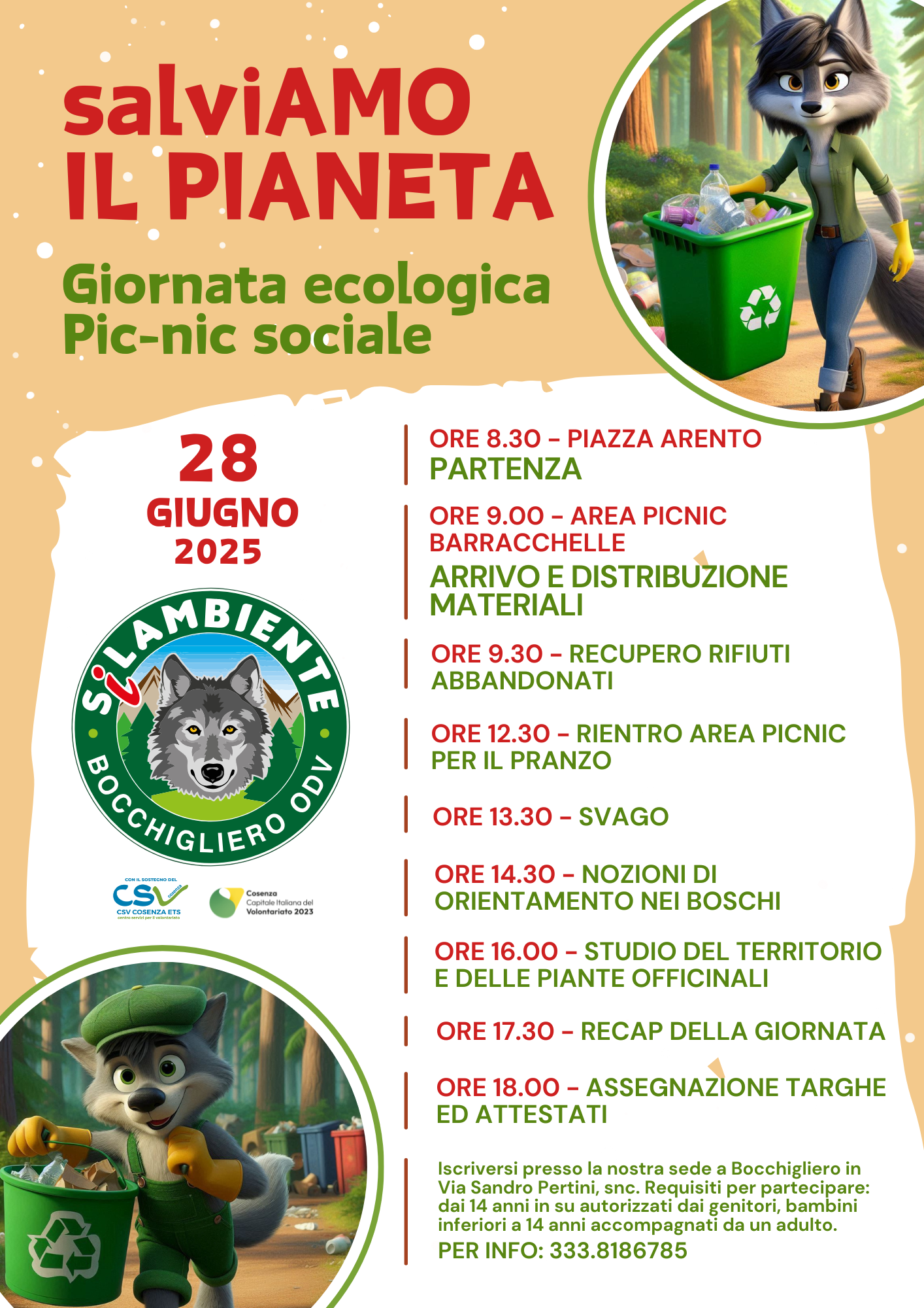 Sabato 28 giugno, a Bocchigliero, alle 8.30, si terrà una giornata ecologica e un picnic sociale. Il raduno dei partecipanti è previsto in piazza Arento per poi confluire nell’area picnic di Contrada Barracchelle dove volontari e cittadini saranno coinvolti nel recupero dei rifiuti abbandonati. Nel pomeriggio è previsto un momento di orientamento e conoscenza del territorio e delle sue risorse.