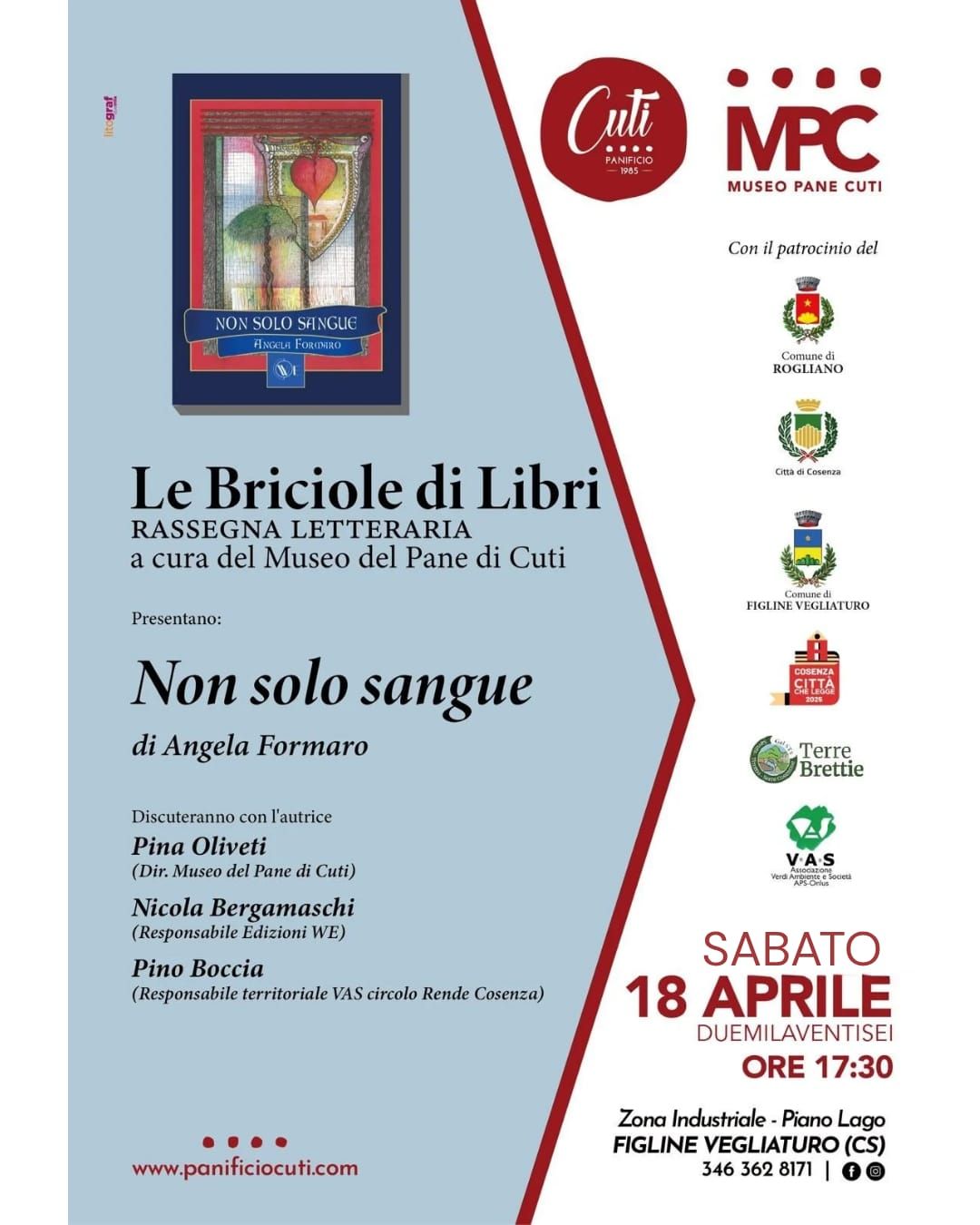 Sabato 18 aprile, alle ore 17.30, al Museo del Pane di Cuti, nella zona industriale di Piano Lago, a Figline Vegliaturo, si terrà la presentazione del libro “Non solo sangue” di Angela Formaro nell’ambito della rassegna letteraria “Le briciole di libri” a cura dello stesso Museo.