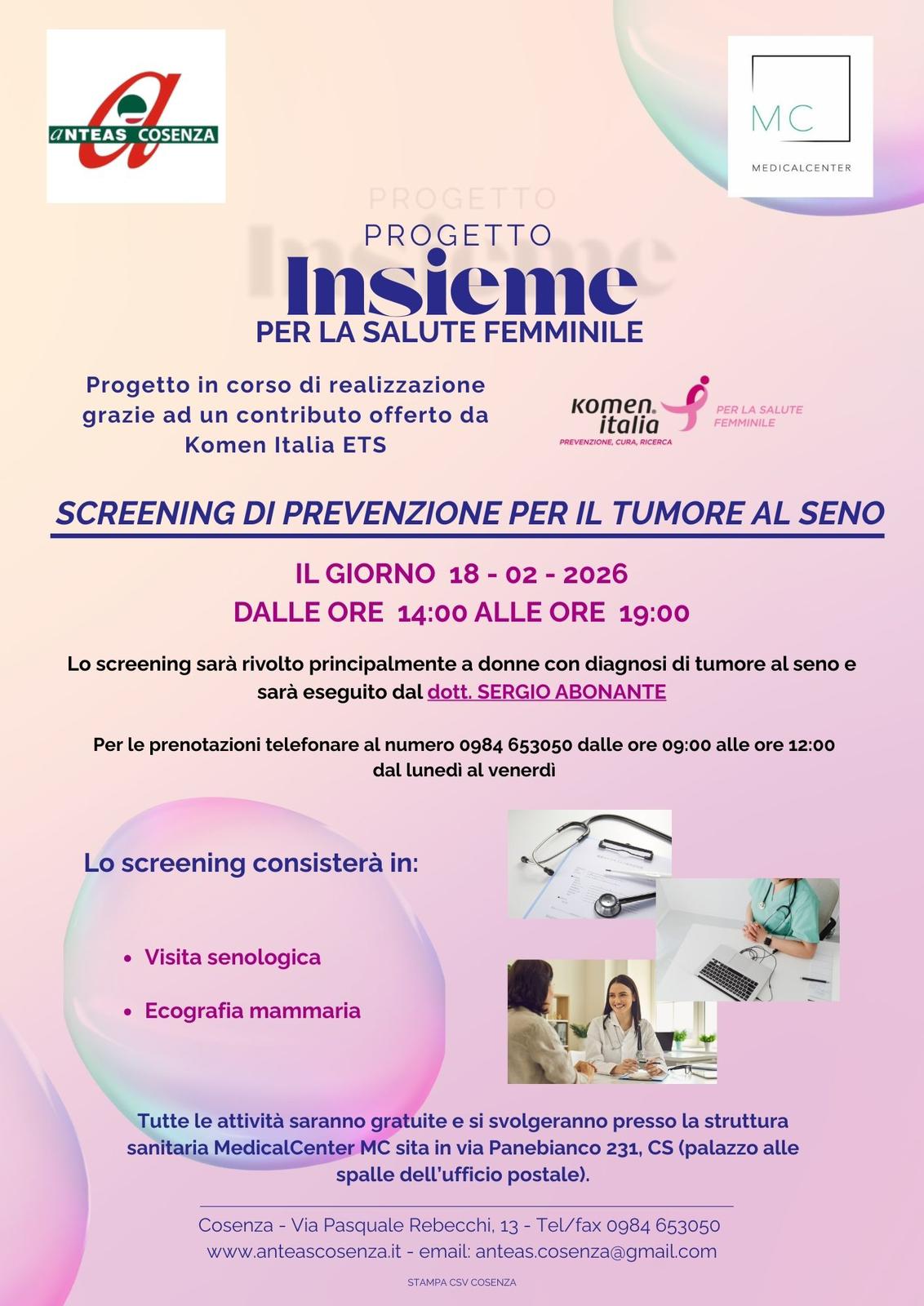 Mercoledì 18 febbraio, nella struttura sanitaria MedicalCenter MC, in via Panebianco, n. 231, a Cosenza (palazzo alle spalle dell’ufficio postale), dalle ore 14 alle 19, si svolgerà uno screening di prevenzione […]