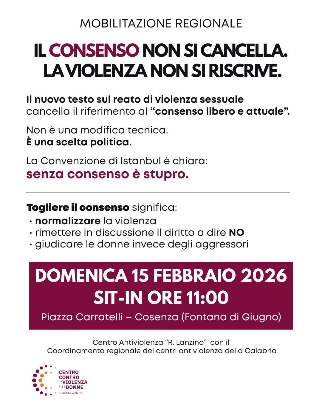 Domenica 15 febbraio, alle 11, a Piazza Carratelli, a Cosenza, si terrà la mobilitazione regionale contro la riformulazione del disegno di legge sulla violenza sessuale che cancella il riferimento al […]