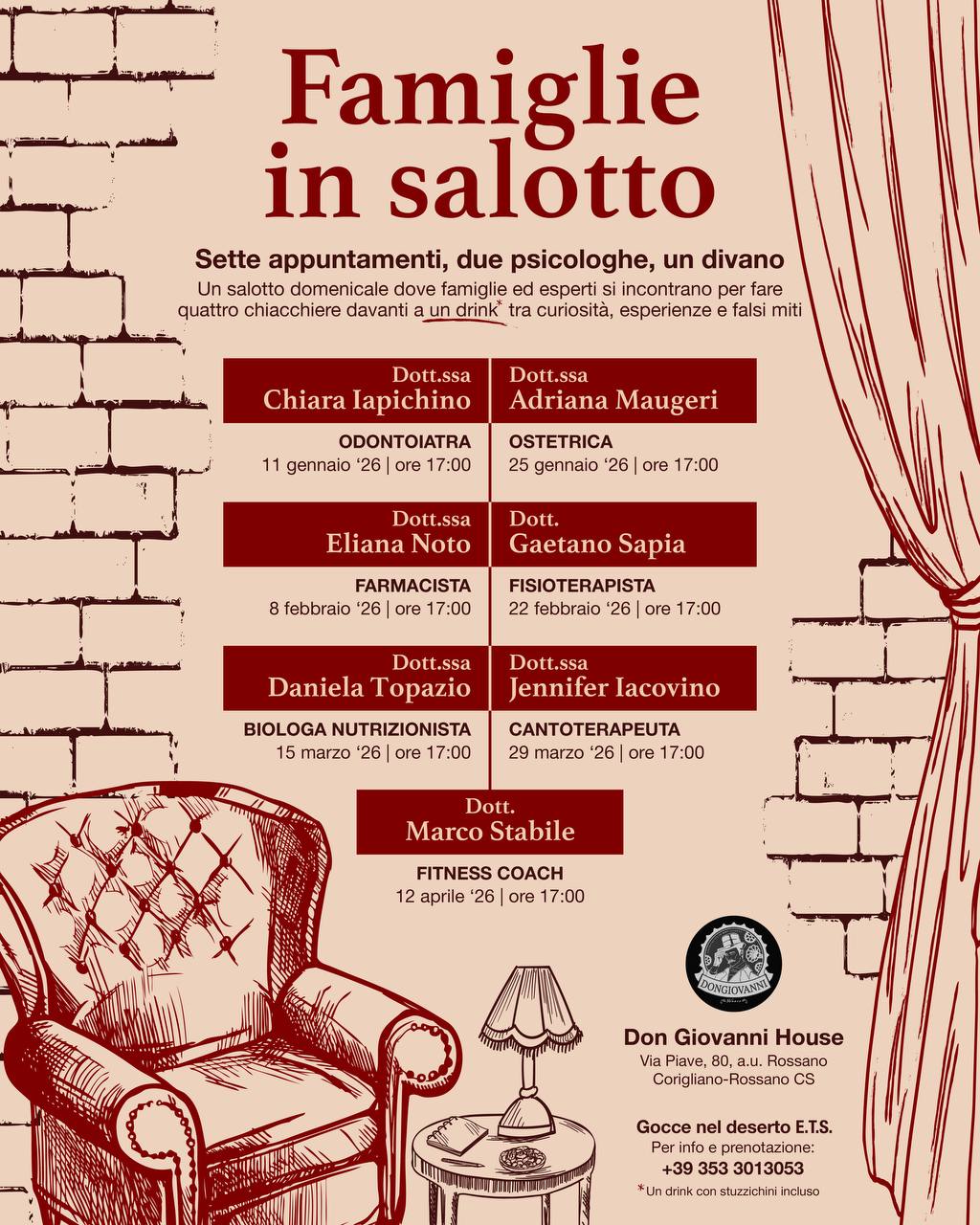 “Famiglie in salotto” è un progetto che nasce da un’idea semplice: sette appuntamenti, due psicologhe, un divano. Un salotto domenicale in cui famiglie ed esperti si incontrano per fare quattro […]