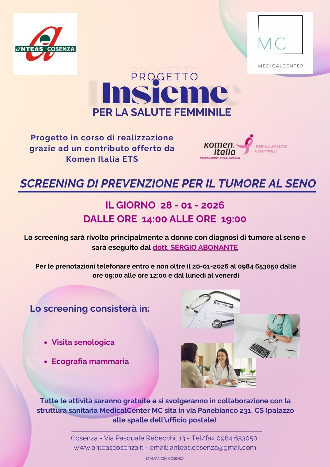 Mercoledì 28 gennaio, nella struttura sanitaria MedicalCenter MC, in via Panebianco, n. 231, a Cosenza (palazzo alle spalle dell’ufficio postale), dalle ore 14 alle 19, si svolgerà uno screening di […]