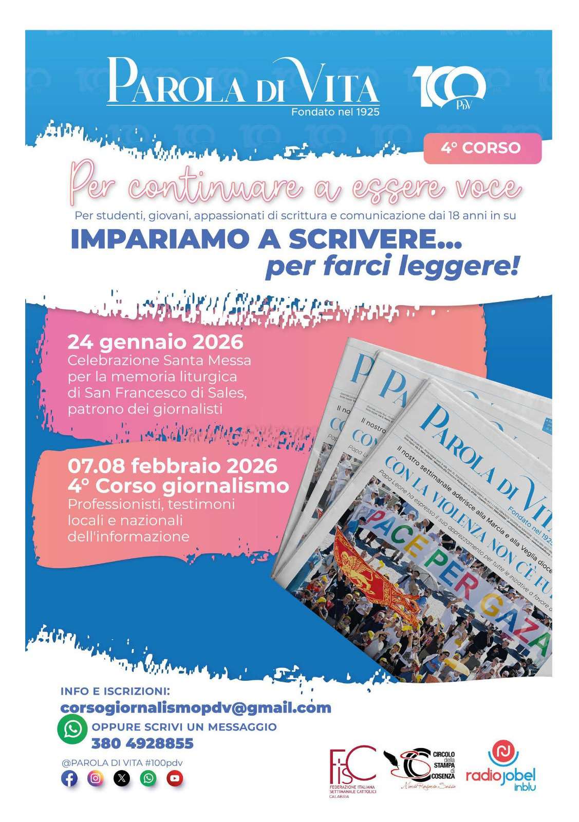 Parola di Vita, settimanale diocesano di informazione, ha organizzato il quarto corso di giornalismo “Impariamo a scrivere … per farci leggere”. Il corso, gratuito, si svolgerà il 7 e l’8 […]