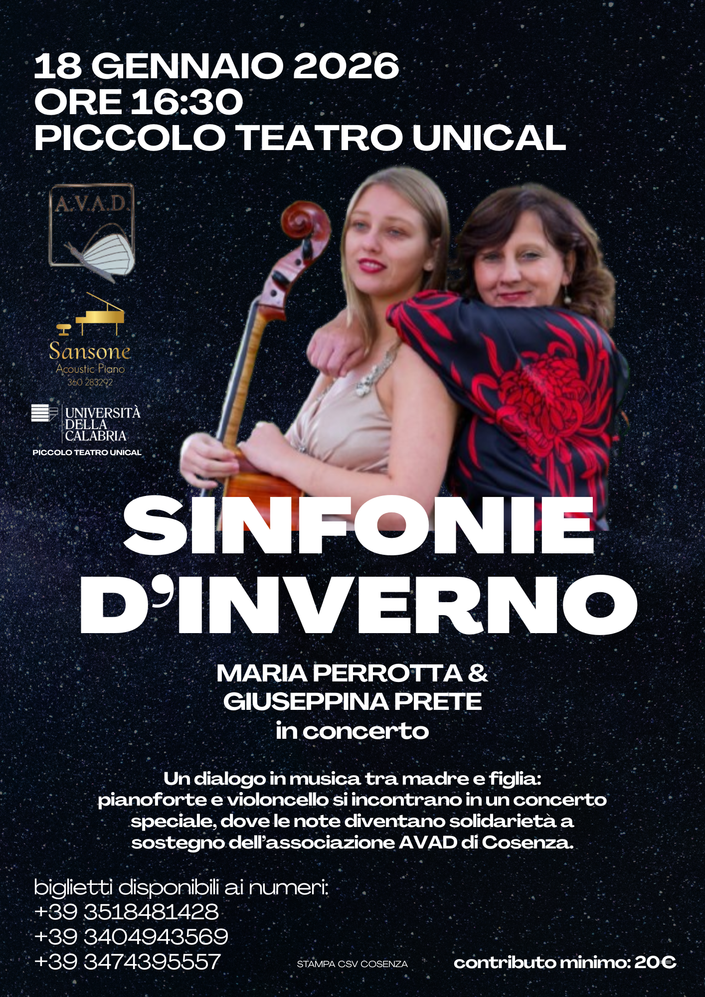 Domenica 18 gennaio, alle ore 16.30, al Piccolo Teatro dell’Università della Calabria, si terrà il concerto “Sinfonie d’inverno”. Un dialogo tra mamma e figlia, Maria Perrotta e Giuseppina Prete, rispettivamente […]