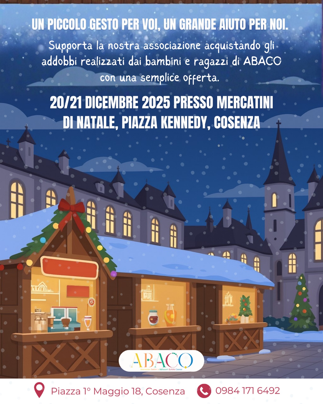 Sabato 20 e domenica 21 dicembre, in piazza Kennedy, a Cosenza, ABACo – Associazione Bambini e Adolescenti Autistici Cosenza APS, allestirà uno stand solidale con l’offerta, in cambio di un […]