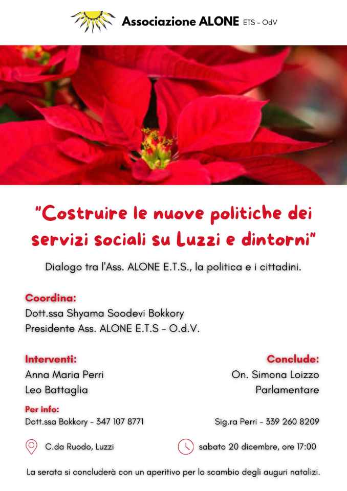 L’Associazione ALONE ETS ODV ha organizzato sabato 20 dicembre, alle ore 17, in contrada Ruodo, a Luzzi, l’incontro “Costruire le nuove politiche dei servizi sociali su Luzzi e dintorni”, dialogo […]