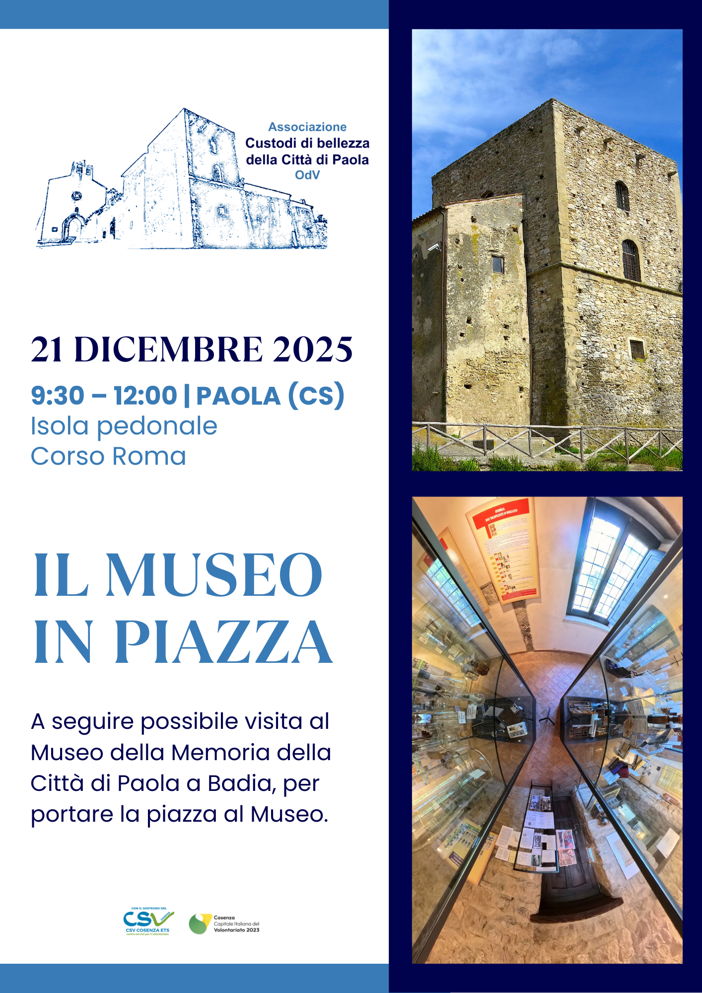 L’associazione Custodi di bellezza della Città di Paola organizzerà il 21 dicembre, dalle ore 9.30 alle 12, nell’isola pedonale di Corso Roma, il Museo in Piazza. L’associazione promuoverà le proprie […]