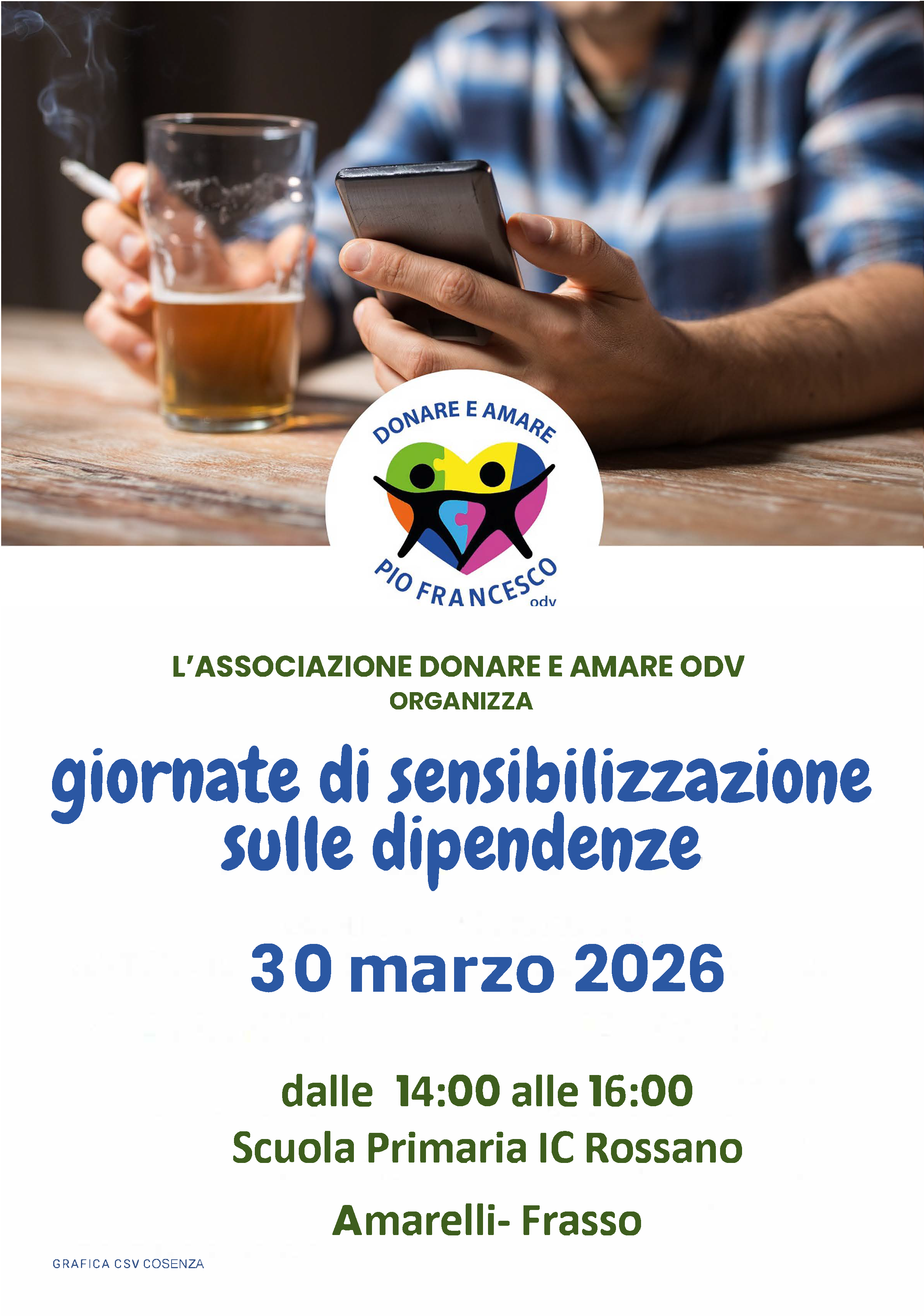 L’associazione Donare e Amare OdV organizza una giornata di sensibilizzazione sulle dipendenze a Corigliano Rossano. L’appuntamento è per lunedì 30 marzo dalle 14 alle 16 alla scuola primaria dell’istituto comprensivo […]