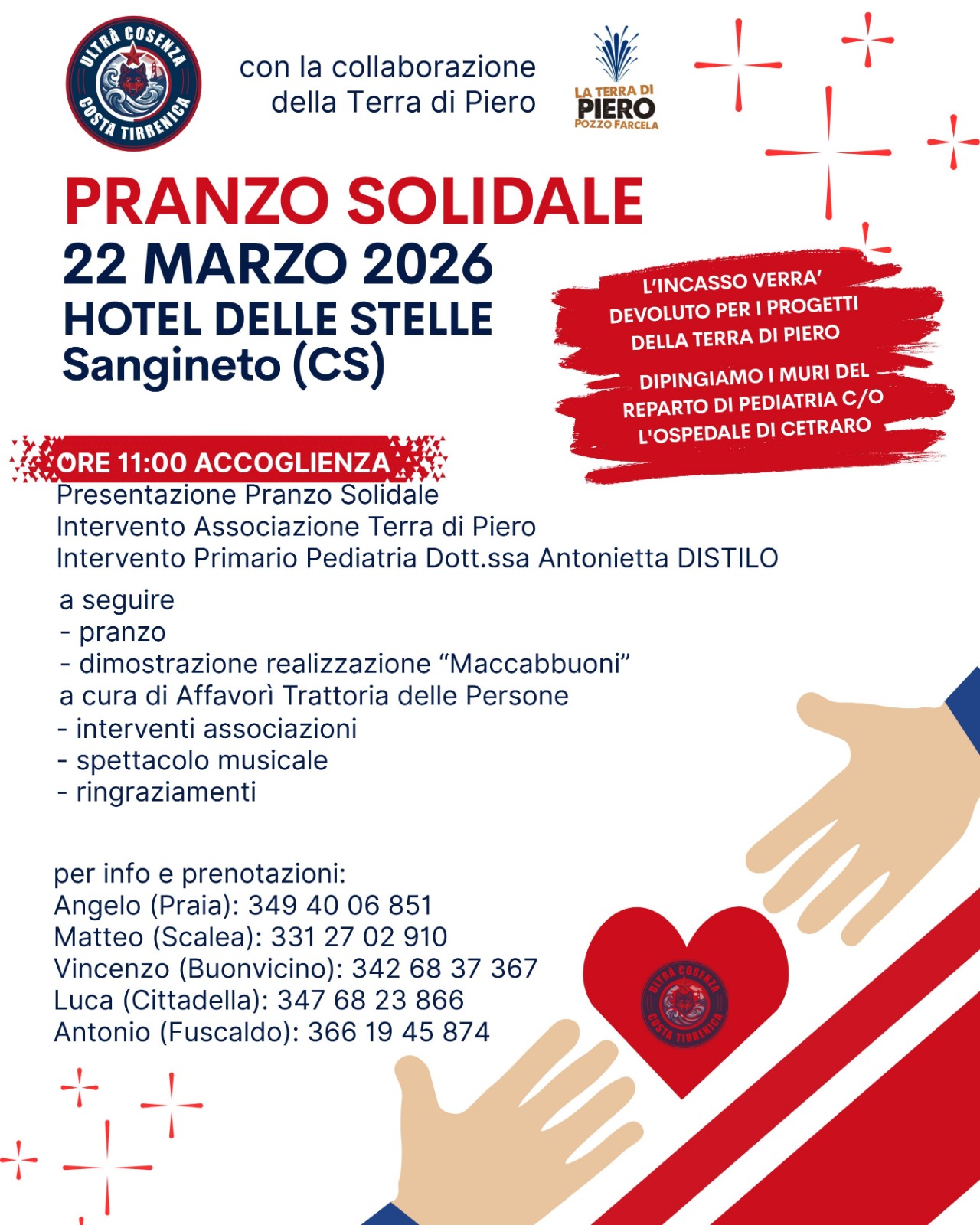 Domenica 22 marzo, alle 11, all’hotel Delle Stelle di Sangineto, Ultrà Cosenza Costa Tirrenica in collaborazione della Terra di Piero, ha organizzato un pranzo solidale. L’incasso sarà devoluto per i […]