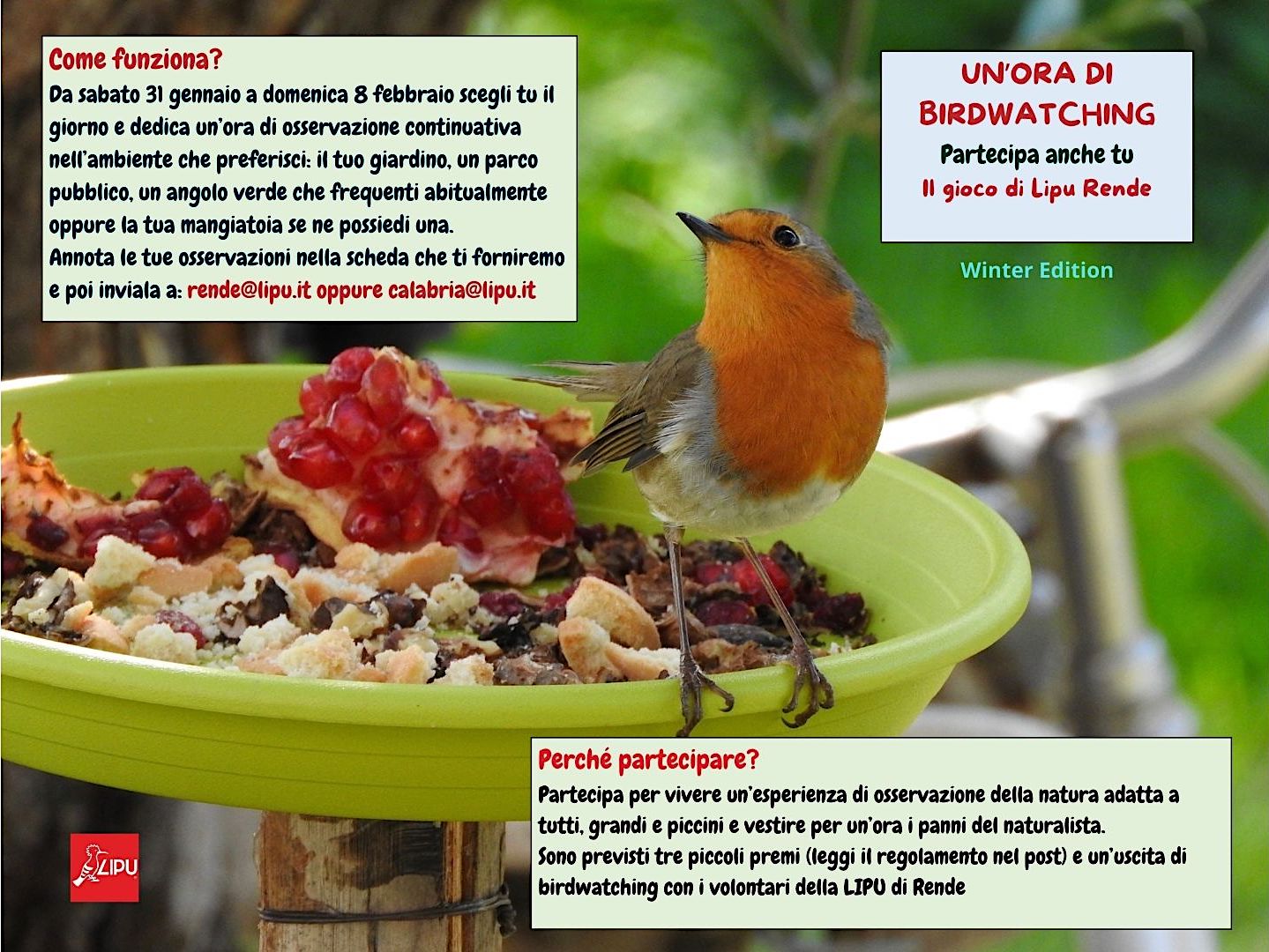 Da sabato 31 gennaio a domenica 8 febbraio si potrà osservare, per un’ora, l’ambiente circostante (il gioco si può svolgere in giardino, in un parco pubblico, in un angolo di campagna, in qualsiasi area verde). Durante quell’ora si potranno annotare le specie di uccelli che si riescono a riconoscere per poi riportarle su una scheda fornita dall’associazione. Per partecipare si può inviare richiesta di iscrizione agli indirizzi di posta elettronica rende@lipu.it e calabria@lipu.it. I volontari invieranno ai partecipanti tutto il materiale necessario (scheda di censimento e istruzioni dettagliate).