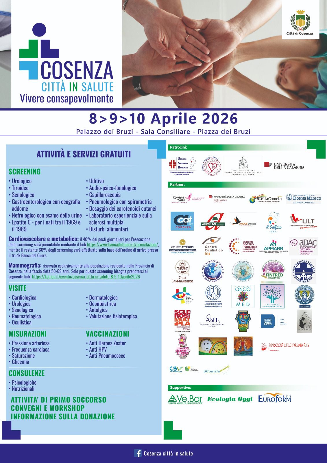 “Cosenza Città in Salute” è un’iniziativa che porta la prevenzione direttamente tra le persone, nei luoghi di incontro quotidiani: le piazze. Lo fa attraverso cliniche mobili all’avanguardia e un team di medici esperti, pronti ad accogliere e assistere gratuitamente chiunque voglia prendersi cura della propria salute. Dall’8 al 10 aprile sarà possibile eseguire screening e visite specialistiche in piazza dei Bruzi grazie alla collaborazione di tante associazioni di volontariato.