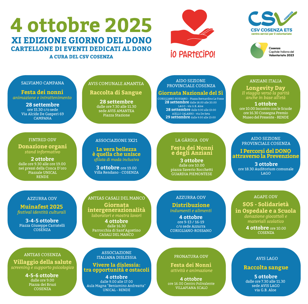 Cosenza e la sua provincia si apprestano a celebrare questa giornata speciale con 15 iniziative organizzate dal 28 settembre al 5 ottobre da 14 Enti di Terzo Settore. Feste dei nonni, promozione della donazione di organi, raccolte di sangue, sfilata di moda inclusiva, attività interculturali, distribuzione di alimenti, screening gratuiti. Sono alcune delle attività proposte dalle associazioni per sensibilizzare l’opinione pubblica ai temi del dono e della gratuità.