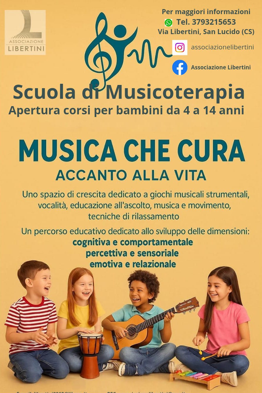 Musica che cura accanto alla vita. L’associazione Libertini di San Lucido promuove la “scuola di musicoterapia”, uno spazio di crescita caratterizzato da giochi musicali, strumentali, vocalità, educazione all’ascolto, movimento, tecniche di rilassamento. Il percorso educativo, rivolto a bambini e ragazzi dai 4 ai 14 anni, con e senza disabilità, è dedicato allo sviluppo delle dimensioni: cognitiva e comportamentale, percettiva e sensoriale, emotiva e relazionale.
