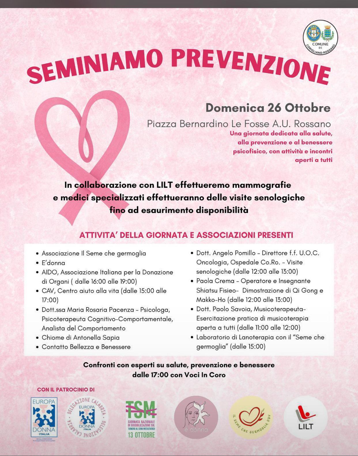 Domenica 26 ottobre, in piazza Bernardino Le Fosse, Area Urbana Rossano del Comune di Corigliano Rossano, si svolgerà una giornata dedicata alla prevenzione e al benessere psicofisico delle donne promossa dall’associazione “Il seme che germoglia ODV”. L’iniziativa che è patrocinata dal Comune vede la collaborazione della LILT (Lega Italiana Lotta Tumori) che effettuerà mammografie e visite senologiche. Saranno presenti le associazioni “È Donna”, AIDO (Associazione Italiana per la Donazione degli Organi) dalle 16 alle 19; CAV (Centro Aiuto alla Vita) dalle 15 alle 17. Dalle ore 17 ci saranno confronti con esperti su salute, prevenzione e benessere con Voci in Coro.