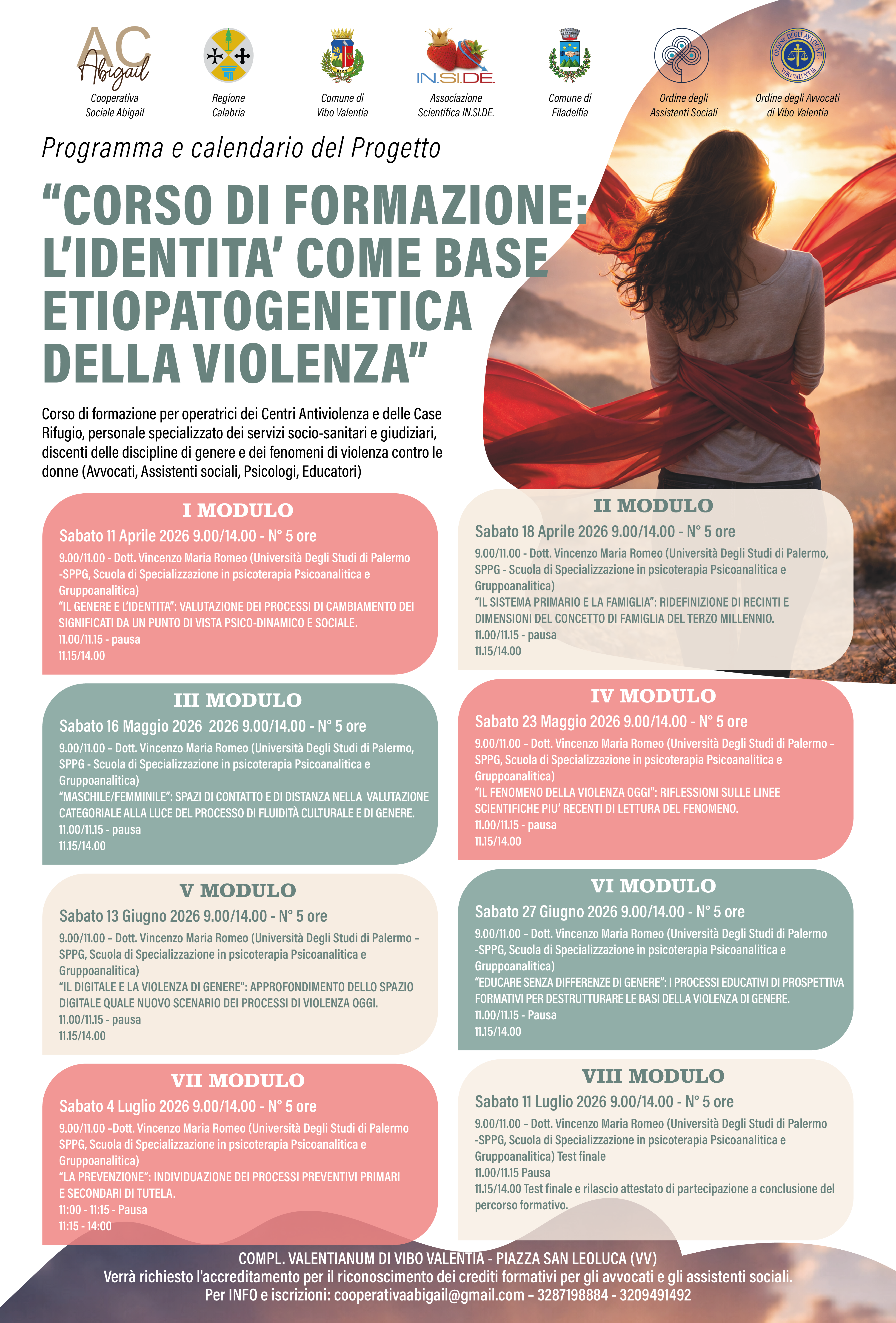 Il corso si svolgerà da sabato 11 aprile e sabato 11 luglio e consta di 8 moduli da 5 ore. I sabati saranno l’11 e il 18 aprile, il 16 e il 23 maggio, il 13 e il 27 giugno, il 4 e l’11 luglio. La formazione si svolgerà dalle ore 9 alle 14 al Complesso Valentianum di Vibo Valentia in piazza San Leoluca. Per informazioni e iscrizioni si può scrivere a cooperativaabigail@gmail.com.